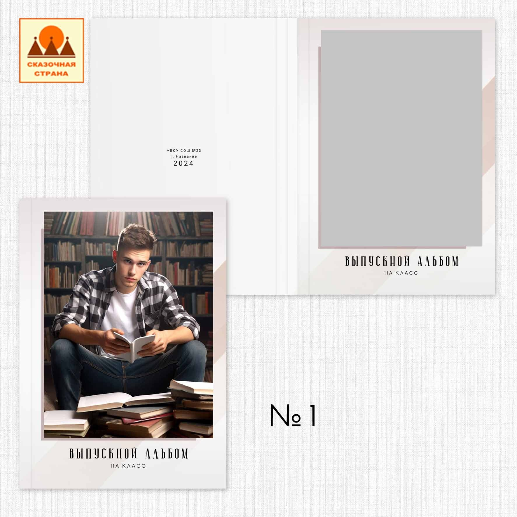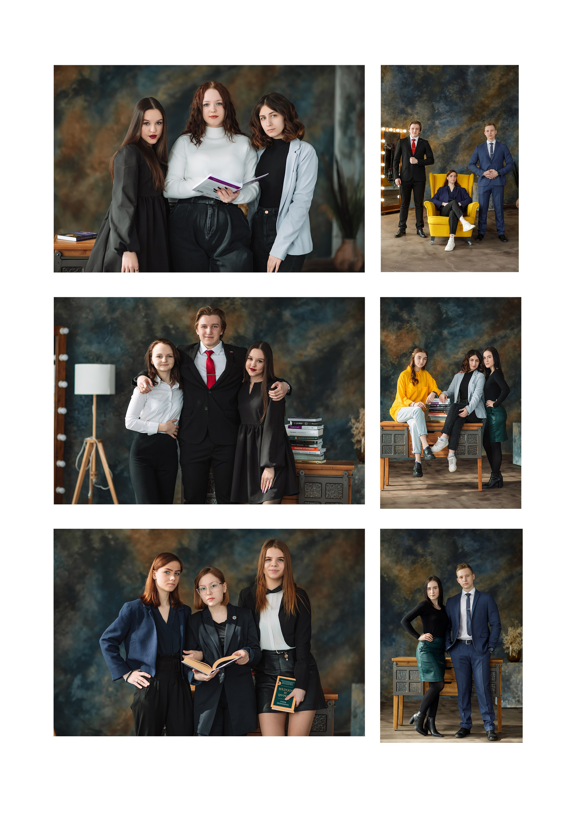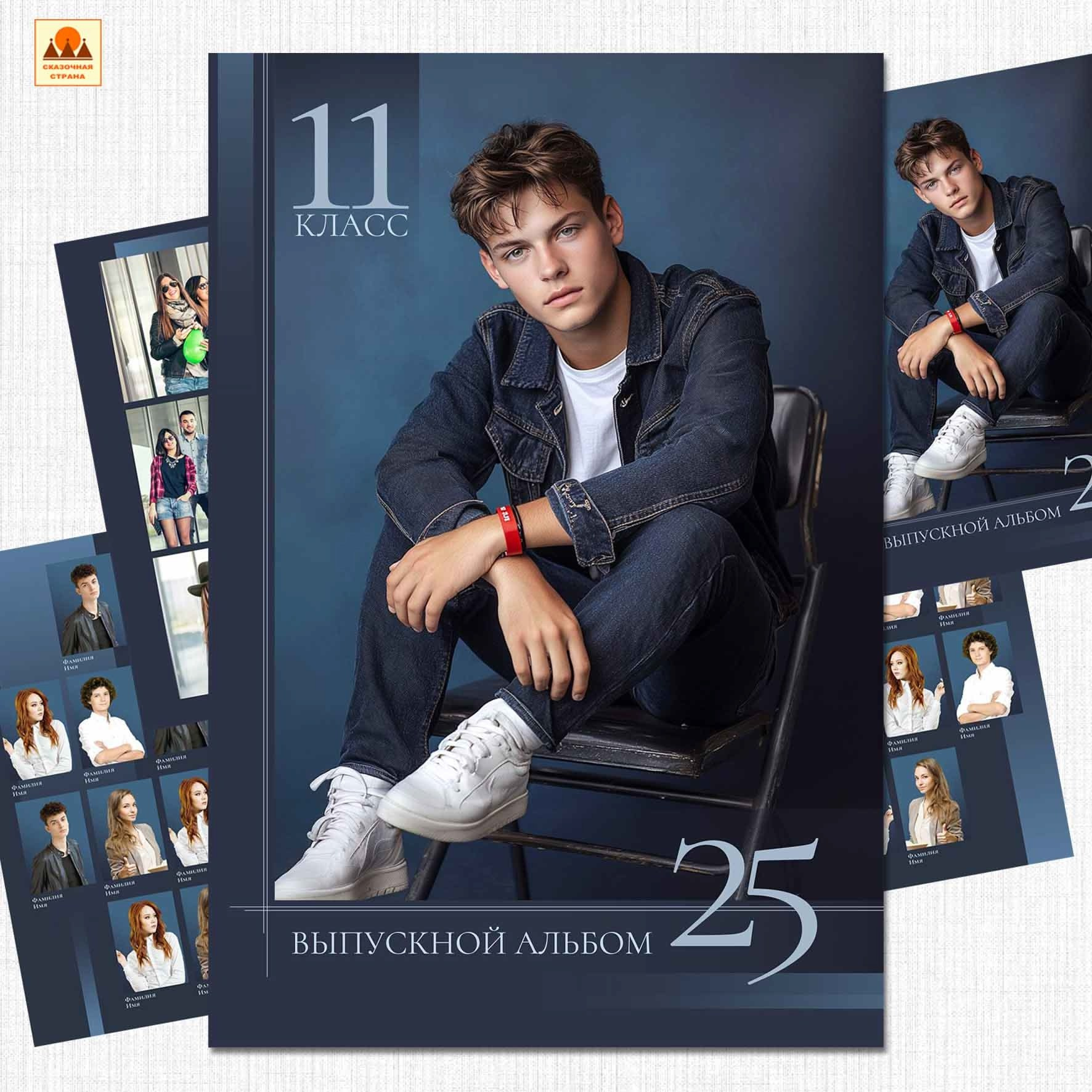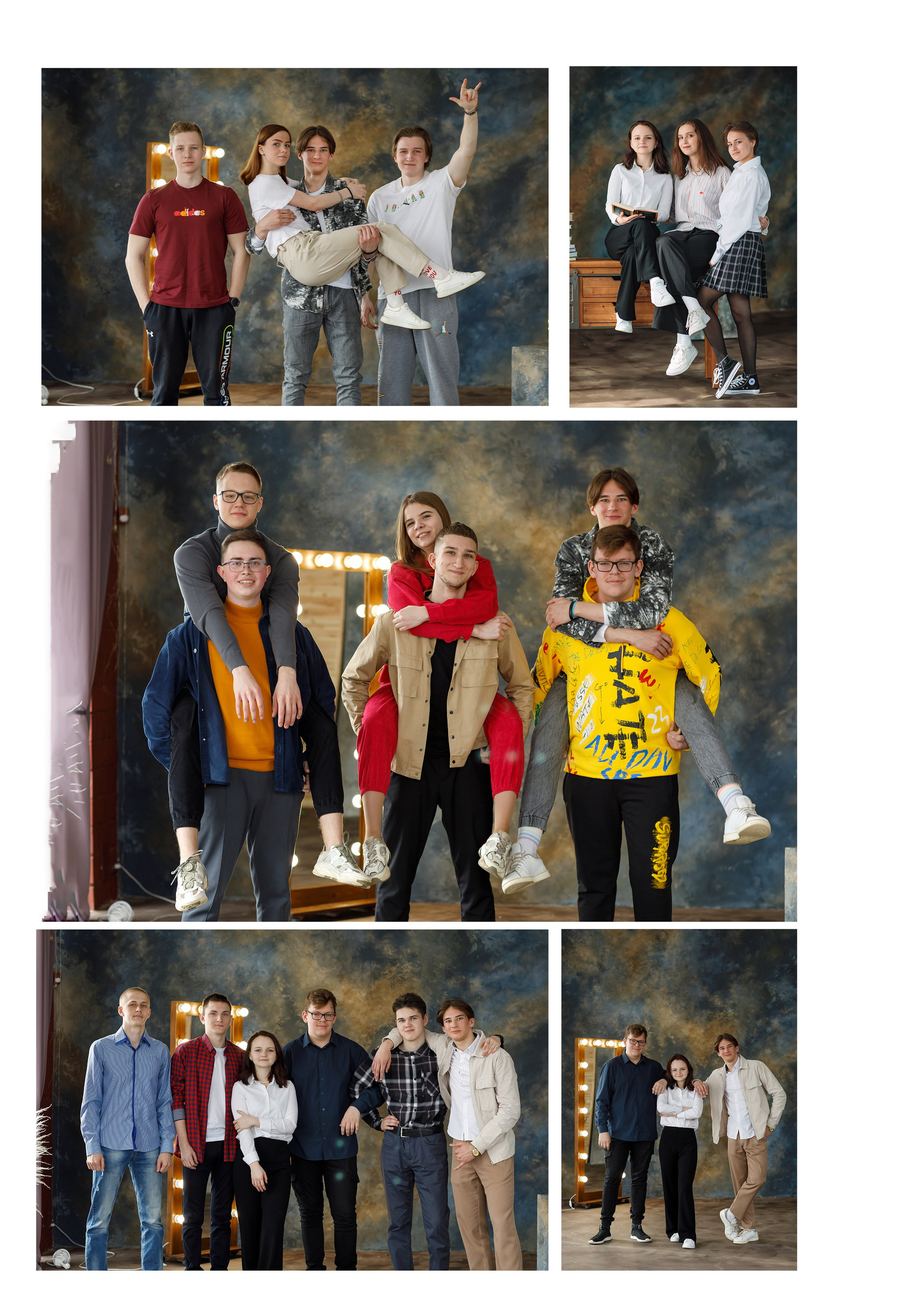 Съемка в студии* или в школе. Первая страница: фото с учителем. 2-3 страница сетка с учениками, именами и фамилиями. По желанию можно разместить по 4 ученика на странице. Далее групповые фото с друзьями. Сетка с учителями по желанию. В конце общая фотография. Возможен выезд на вторую съемку, например на улице.