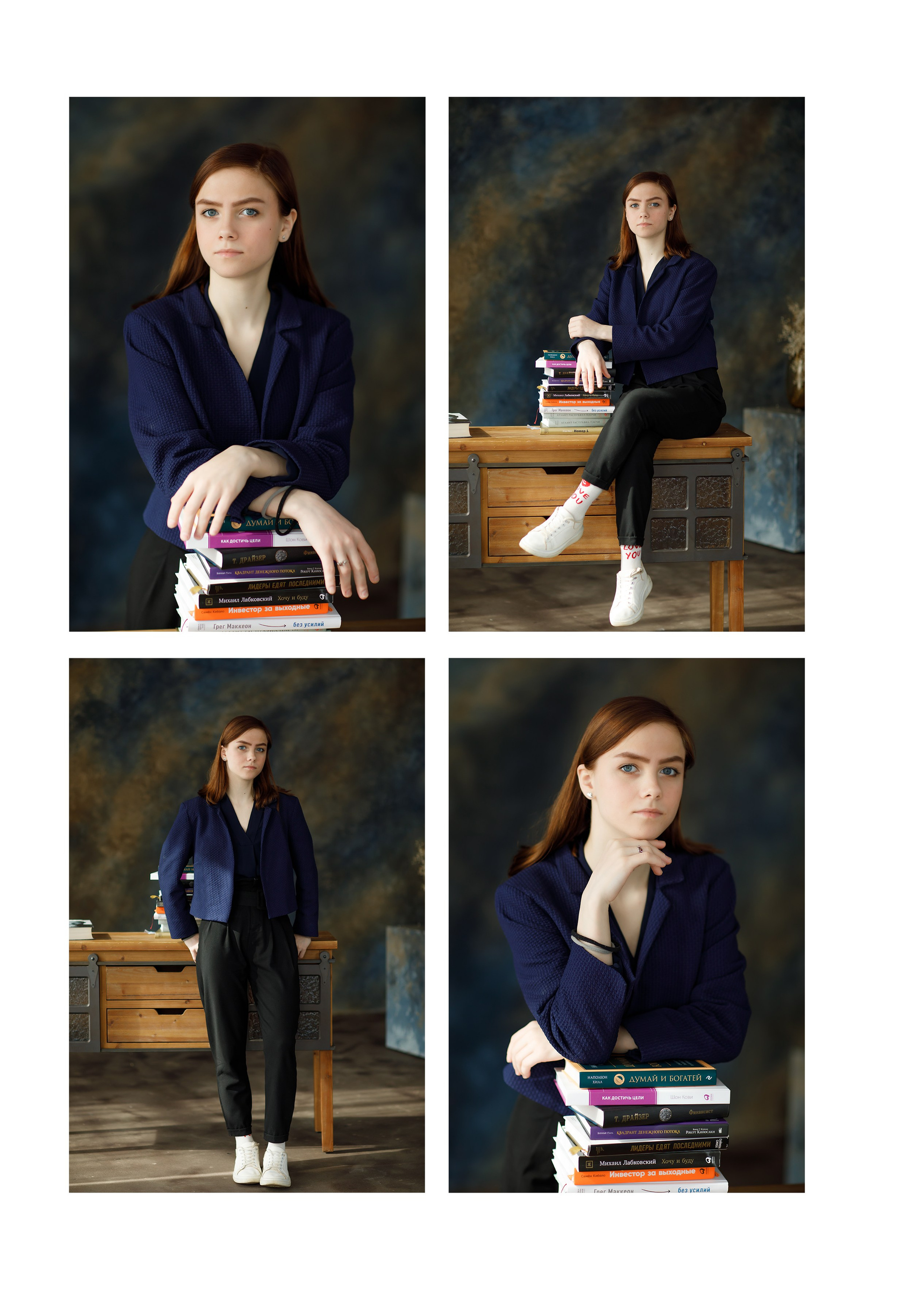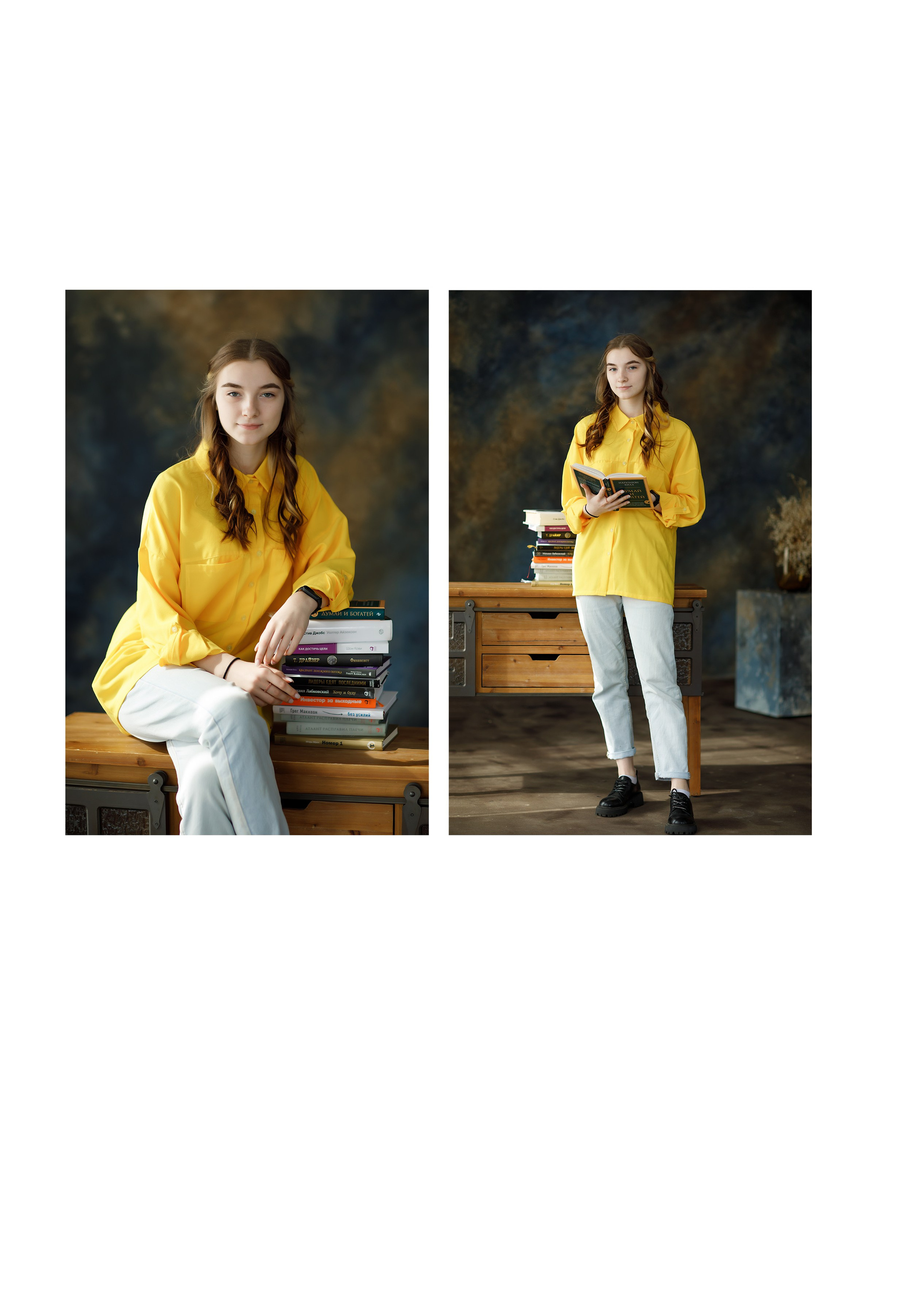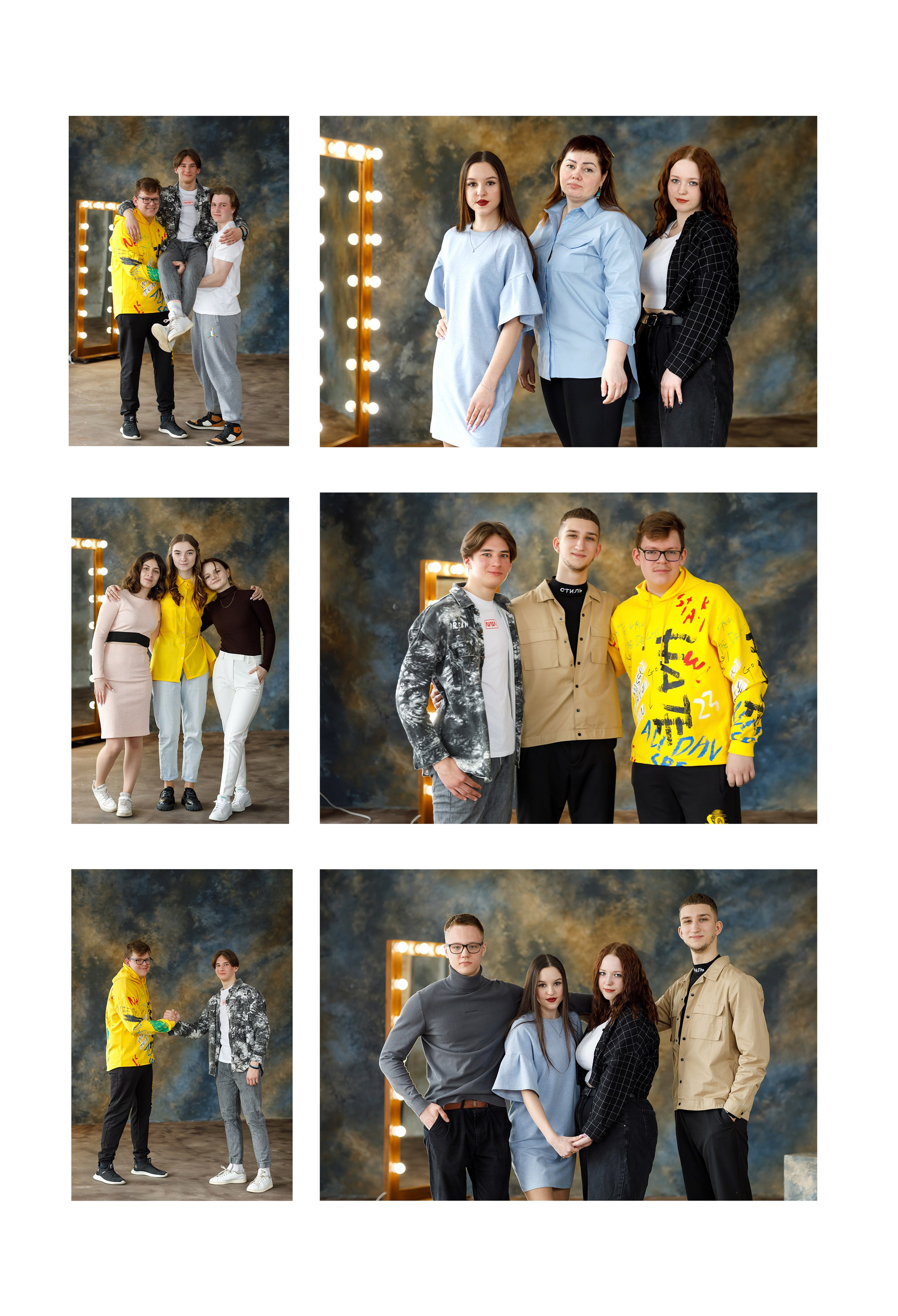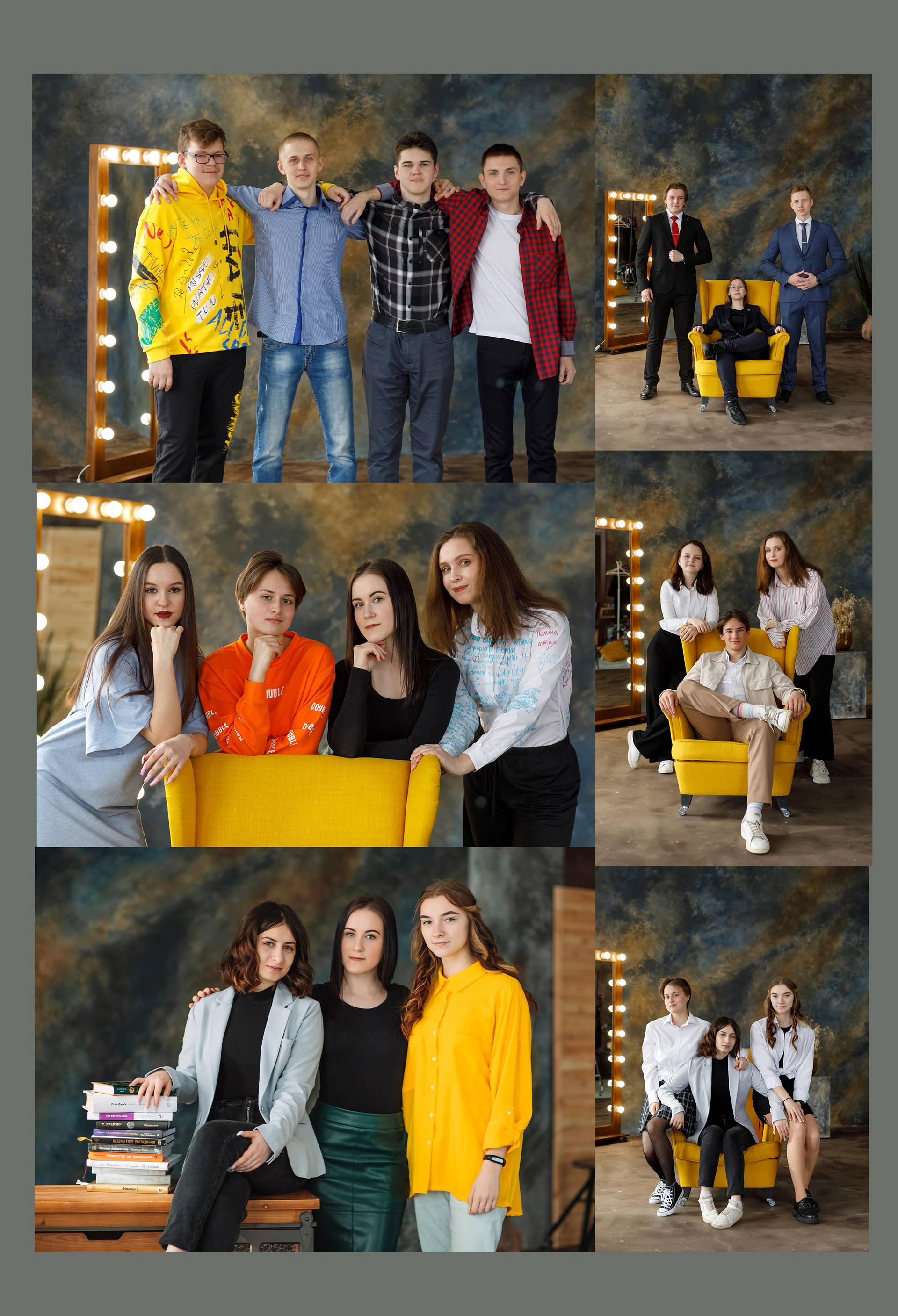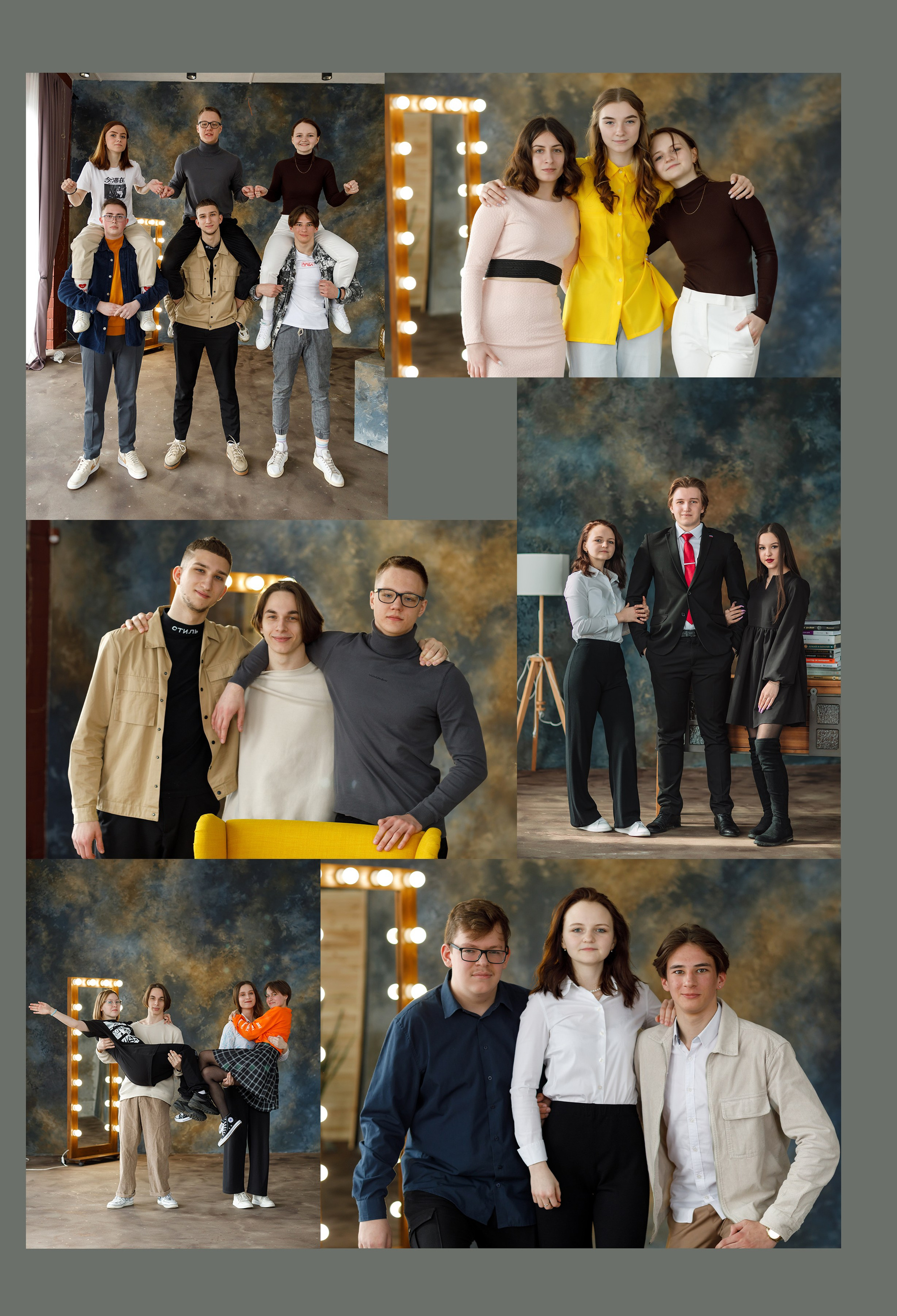 Съемка в студии* или в школе. Первая страница: фото с учителем. 2-3 страница сетка с учениками, именами и фамилиями. По желанию можно разместить по 4 ученика на странице. Далее групповые фото с друзьями. Сетка с учителями по желанию. В конце общая фотография. Возможен выезд на вторую съемку, например на улице.